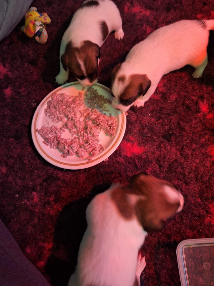 Seit etwa einer halben Woche fressen die Welpen nun selbstständig. Neben der Milch ihrer Mutter nehmen sie nun auch feines, für sie zubereitetes Hackfleisch zu sich. Die Umstellung verläuft problemlos, und die Kleinen zeigen großen Appetit und Neugier auf die neue Nahrung.